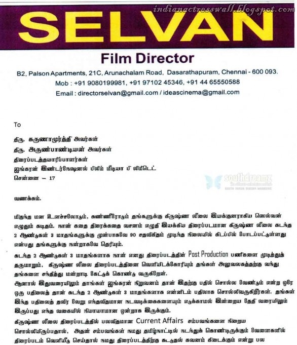All times I speak abt our Film’s Current Affairs Contents Issues are fade out and begging abt to release the Film ‘KRISHNA LEELAI’ in the Proper Time of the above said issues happened whenever in our State. But from the Last 2 years and 3 months no any other responses and no any single activities from your concern abt the Post Production completion and Release also.